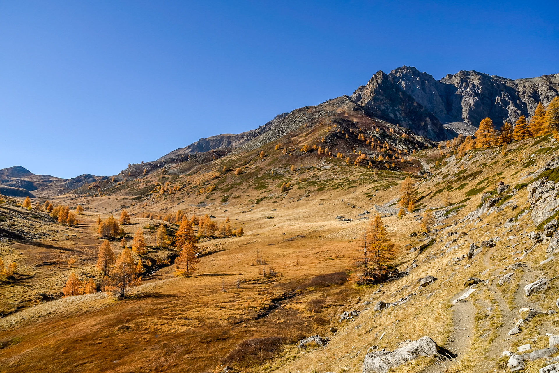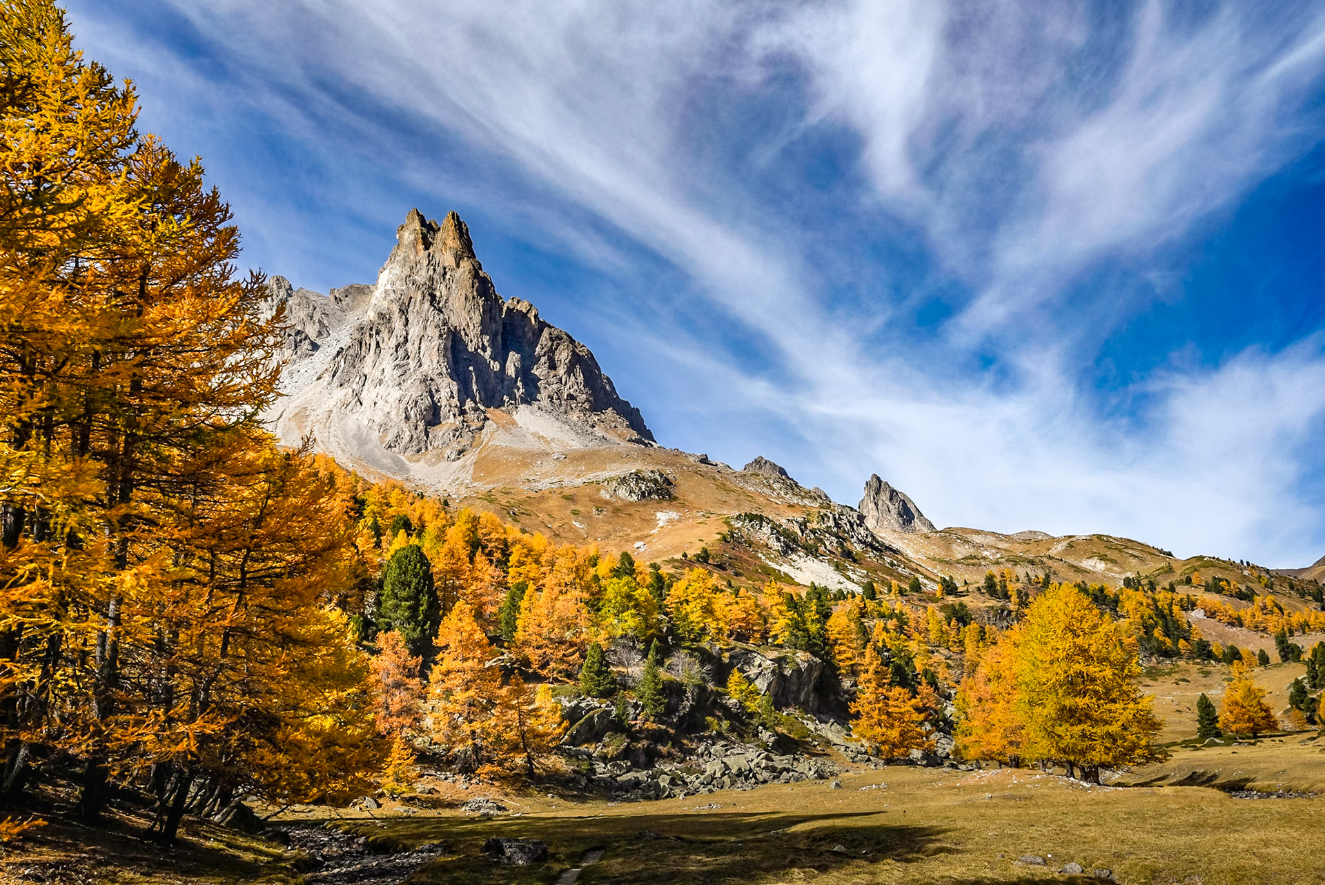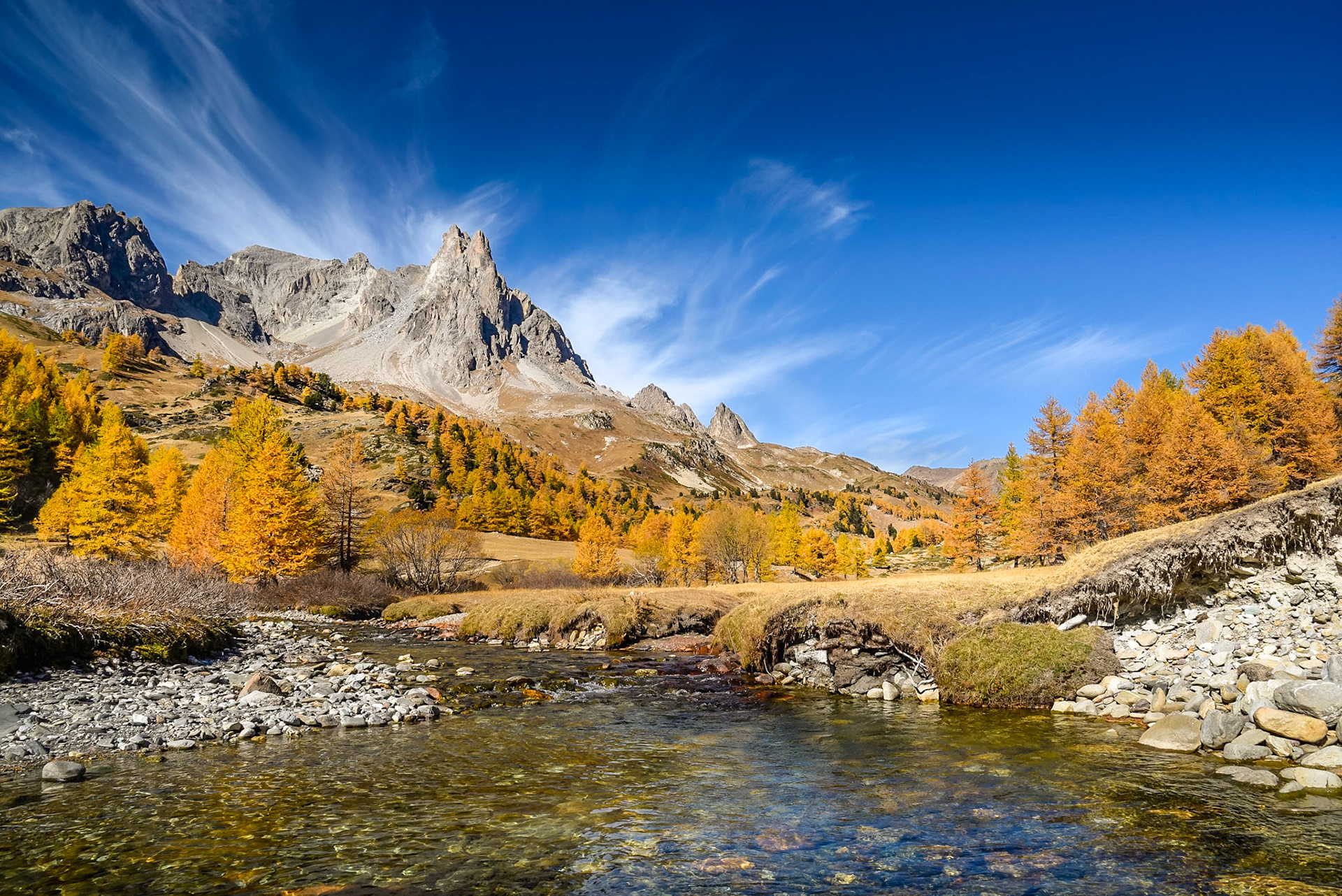 Au Nord Est de Briançon, à près de 2000m d'altitude, cette vallée préservée, classée, est avant tout territoire naturel merveilleux en toutes saisons. Vers la mi octobre les mélèzes prennent feu pour donner ces paysages incroyables presque irréels