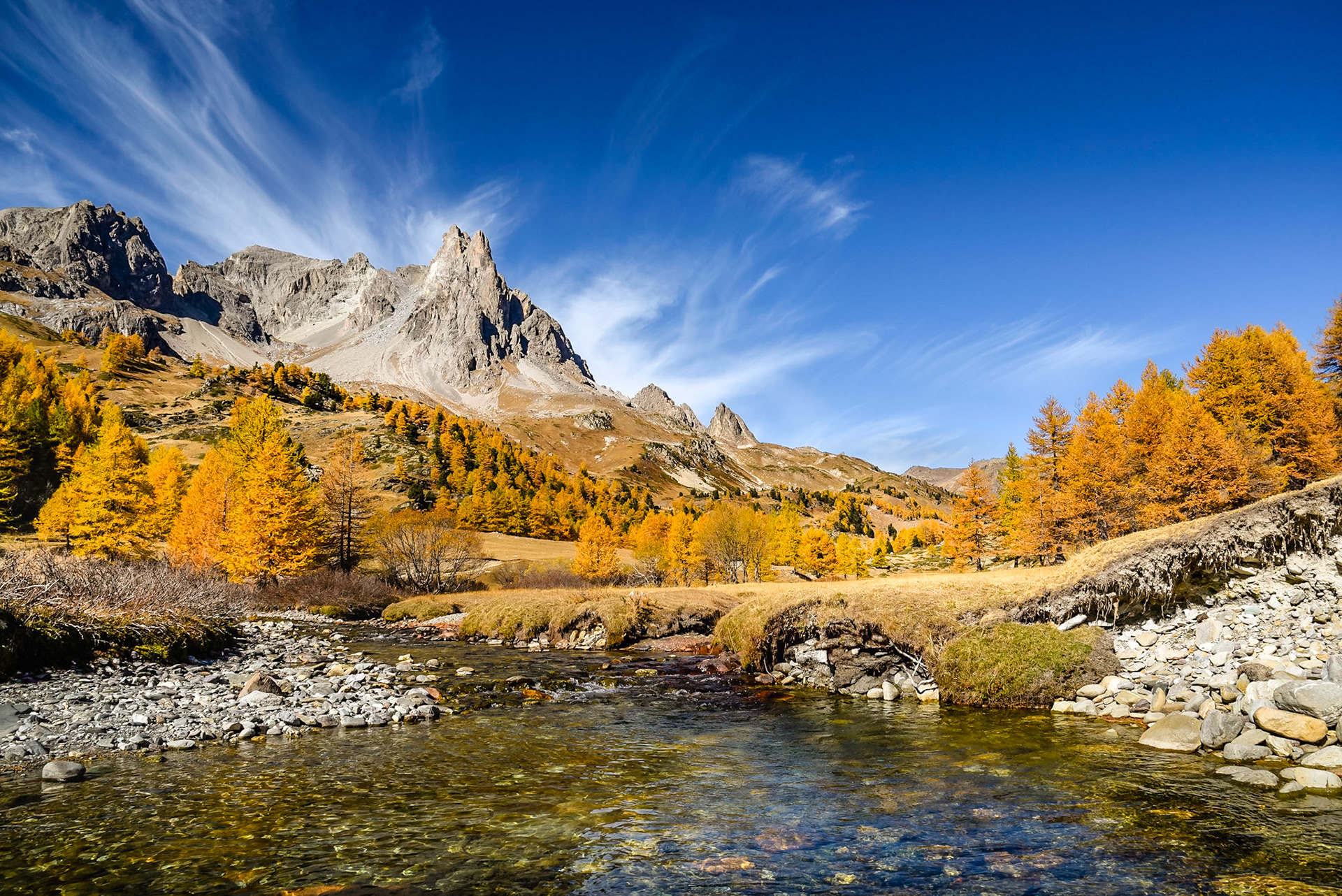 Après Névache, quand vous vous enfoncez dans la vallée de la Haute Clarée, vous arrivez au hameau de Fontcouverte où trône cette belle chapelle. Elle a été construite en 1627 sur un rocher usé, à l'endroit d'une source miraculeuse cachée par des buissons ! D'où son nom de : 'Fontaine couverte'Ici, elle est bien mise en valeur par la jolie lumière d'automnecet les mélèzes en feu